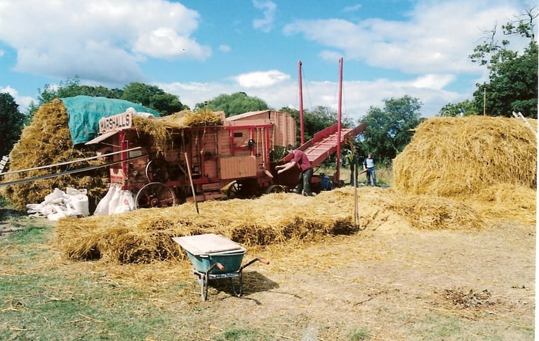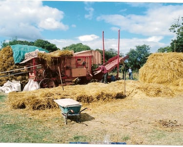 A busy day for a crowd of people. Someone on the steam traction engine, another on the rick feeding the person feeding the threshing mill. The grain bags need watching too - filling fast. And the threshed straw flowing into the elevator, being stacked and read for those thatched houses that oh-so-need those long stalks.