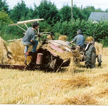Setting up the old McCormac binder behind the Ferguson 20, routing the twine through the knotting mechanism, and off we go. A day's work stucking the sheeves for a week or two until ready to bring for threshing.